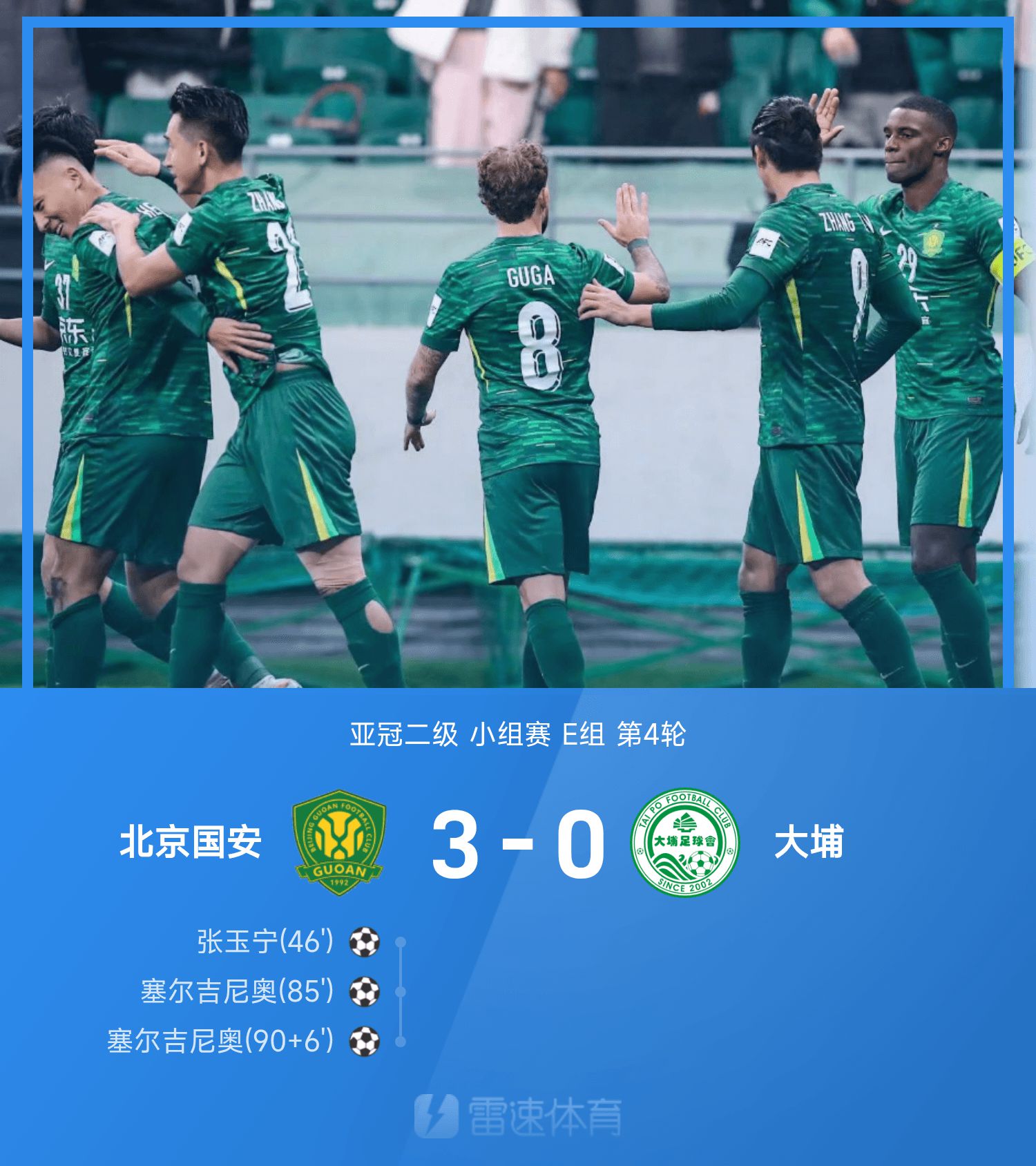 6686 Sports сообщил 6 ноября, что в 4-м туре группы E матча второй группы Лиги чемпионов АФК 25/26 Пекин Гоань победил Дабу со счетом 3–0. В первом тайме ни одна из команд не добилась никаких успехов, а вратарь Гоаня Чжан Цзяньчжи чуть не сделал подарок; Всего через минуту после начала второго тайма Чжан Юнин вывел Гоаня из тупика, а затем Сержиньо, вышедший на поле в качестве запасного игрока, забил дважды, в том числе головокружительный гол. В итоге Пекин Гоань победил Дабу со счетом 3:0 и впервые в этом сезоне выиграл Лигу чемпионов АФК, избавился от дна и переместился на третье место.