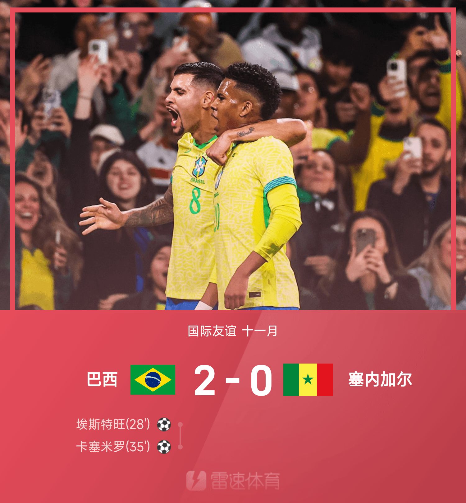 6686 Спорт 16 ноября В 25-м сезоне международной дружбы в ноябре Бразилия победила Сенегал со счетом 2:0. В первой половине игры Эстебан сильно пробил по воротам справа, а Каземиро воспользовался неверным шансом соперника забить. Во втором тайме ни одна из сторон не добилась никаких успехов, и Габриэль покинул поле из-за травмы.