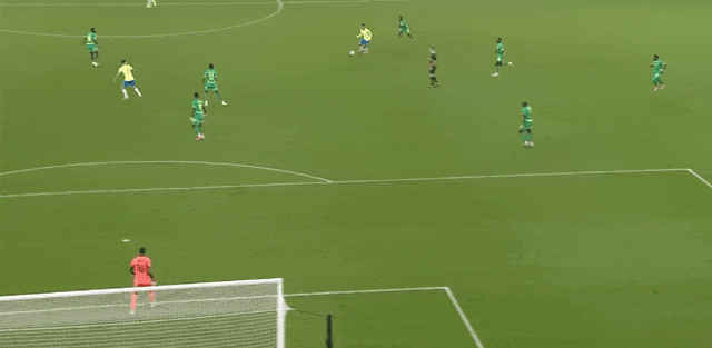 45' Трехсекундная зона Бразилии была неспокойной, и Эдерсон дважды подряд блокировал удар соперника