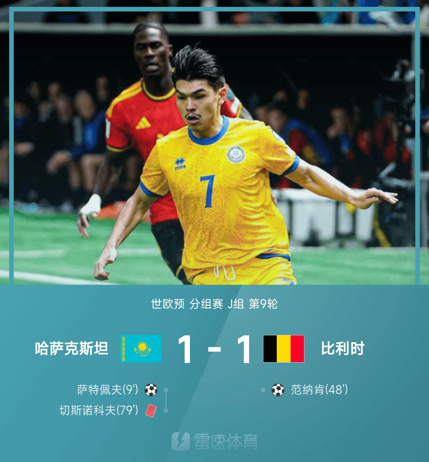 6686 Sports сообщил 15 ноября, что в 9-м туре группы J 26-го чемпионата мира по европейской квалификации Казахстан сыграл вничью с Бельгией со счетом 1:1. В первой половине игры Сатепев воспользовался шансом Тейта забить единственный гол. Во втором тайме Ваннакен головой пробил и сравнял счет. Затем Бельгия пошла в яростную атаку, и Чесноков вышел на красную линию, но счет 1:1 сохранялся до конца, и Бельгия упустила шанс выйти на чемпионат мира.