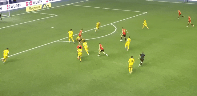 5' Троссард пробил со стандарта, Самородов выбил мяч, и мяч чуть не попал в его собственные дверь