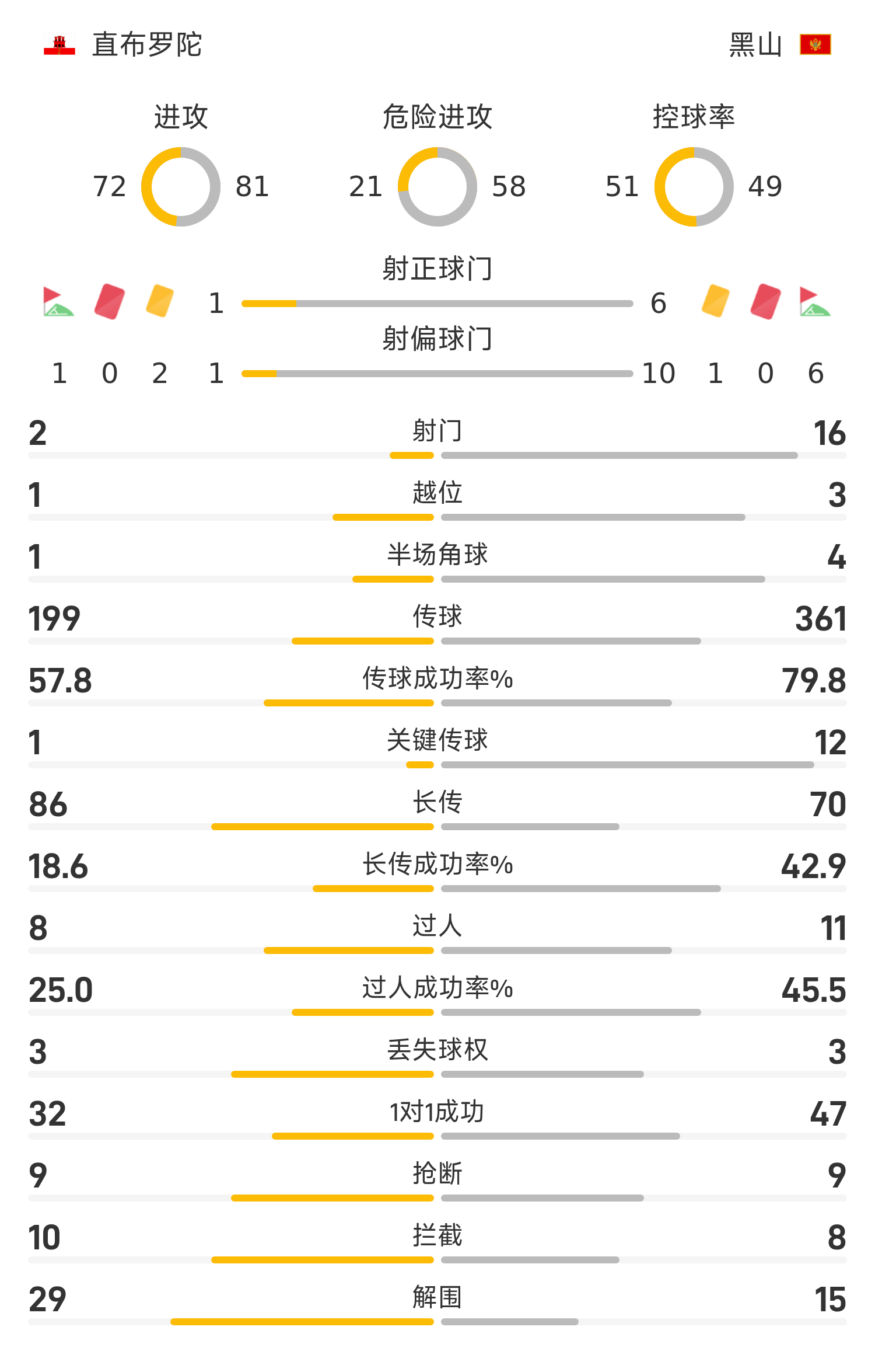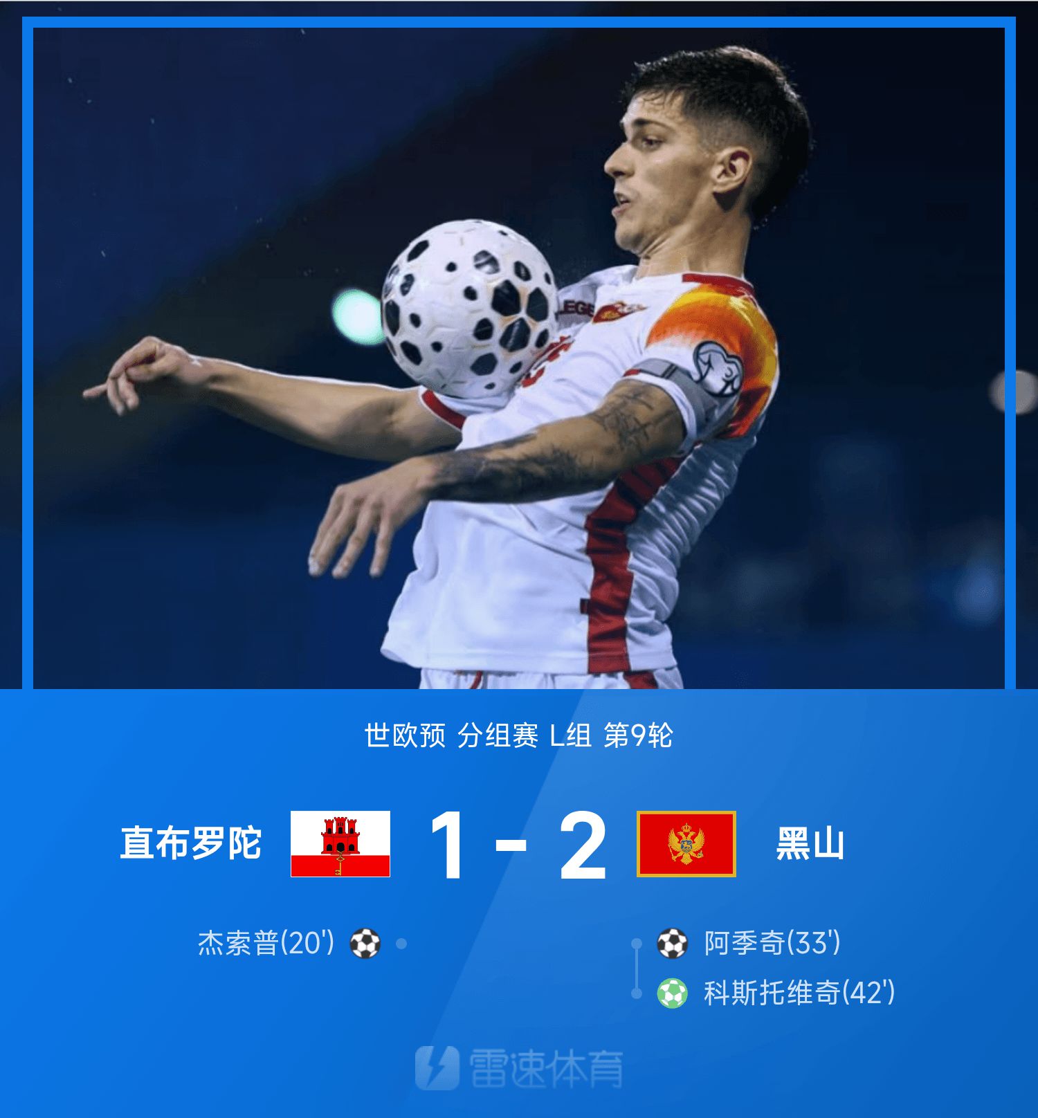 6686 Sports сообщил 15 ноября, что в девятом раунде группы L чемпионата мира по Европе Гибралтар встретился с Черногорией на площадке хозяев поля. В первой половине этой кампании Джессоп забил единственный гол, Аджич реализовал штрафной и сравнял счет, а Костович реализовал пенальти. После смены сторон и новой борьбы ни одна из сторон не забила гола. Игра завершилась победой Черногории над Гибралтаром 2:1.