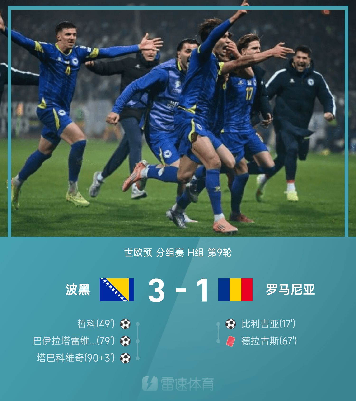 6686 Sports сообщила 16 ноября, что в 9-м туре группы H 26-го чемпионата мира по европейской квалификации Босния и Герцеговина дома встретилась с Румынией. Первый тайм Румыния начала фантастически: Вилладжия забила гол. Во втором тайме Босния и Герцеговина начала проявлять свои силы, и Джеко сравнял счет, пробив голкипера. Драгус был удален за серьезное нарушение правил на второй минуте игры. Десять мужчин Румынии встретились с Боснией и Герцеговиной. На 79-й минуте Байлатаревич забил гол, переломив ситуацию, а Табакович забил гол, завершив игру. Вилладжия не сумела забить гол и спасти спасителя. В конце концов, Босния и Герцеговина победила Румынию из десяти человек со счетом 3–1.