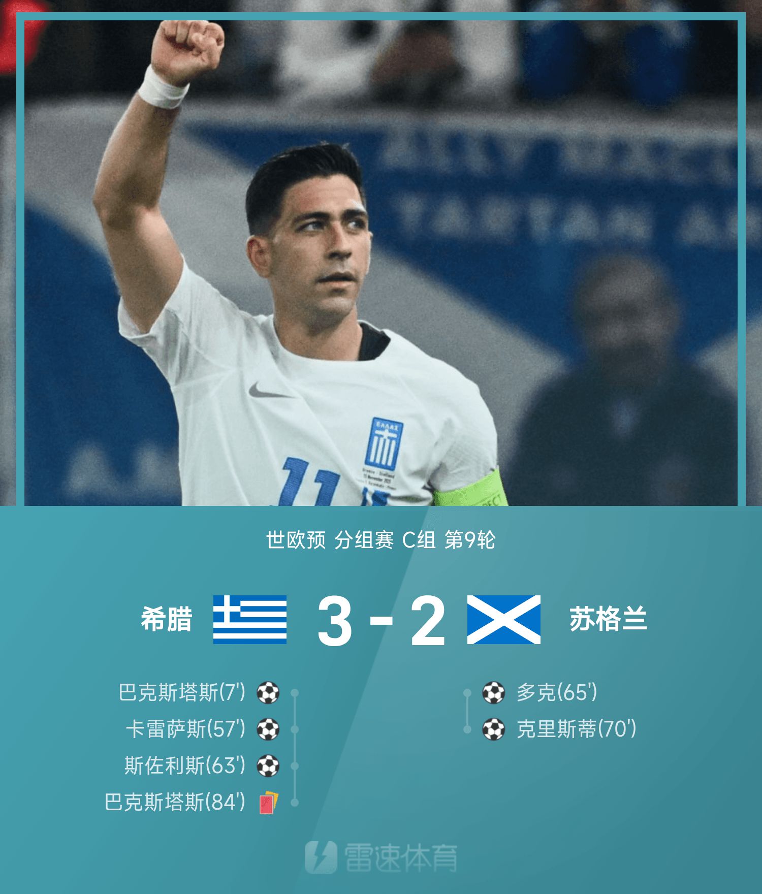 6686 Sports сообщил 16 ноября, что в 9-м туре группы C 26-го чемпионата мира по европейской квалификации Греция победила Шотландию со счетом 3–2. На протяжении всей игры Бакстас был красным после паса и броска, Солис и Каресас забивали и забивали, Доак и Кристи забили два гола подряд, а Шотландия упустила возможность пройти мимо.