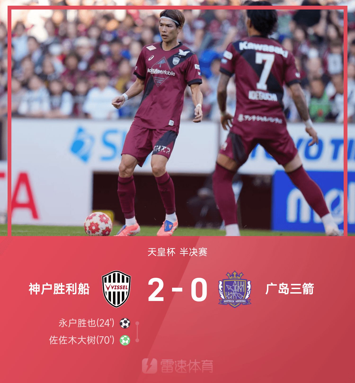 6686 Sports сообщил 16 ноября, что в полуфинале 25-го Кубка Императора Кобе одержал победу со счетом 2:0 над Санфречче Хиросима. В первом тайме Кацуя Нагабе забил из-за пределов и помог Кобе открыть счет. Сменив сторону, чтобы снова сражаться, Исаму Осако реализовал 12-ярдовый пенальти и был спасен. Однако голкипер «Хиросимы Санфречче» вышел вперед и был жестоко наказан. В конце концов, Дайки Сасаки нанес точечный бросок, что помогло Кобе выиграть игру и закрепить победу, а также выйти в финал Кубка Императора два года подряд.