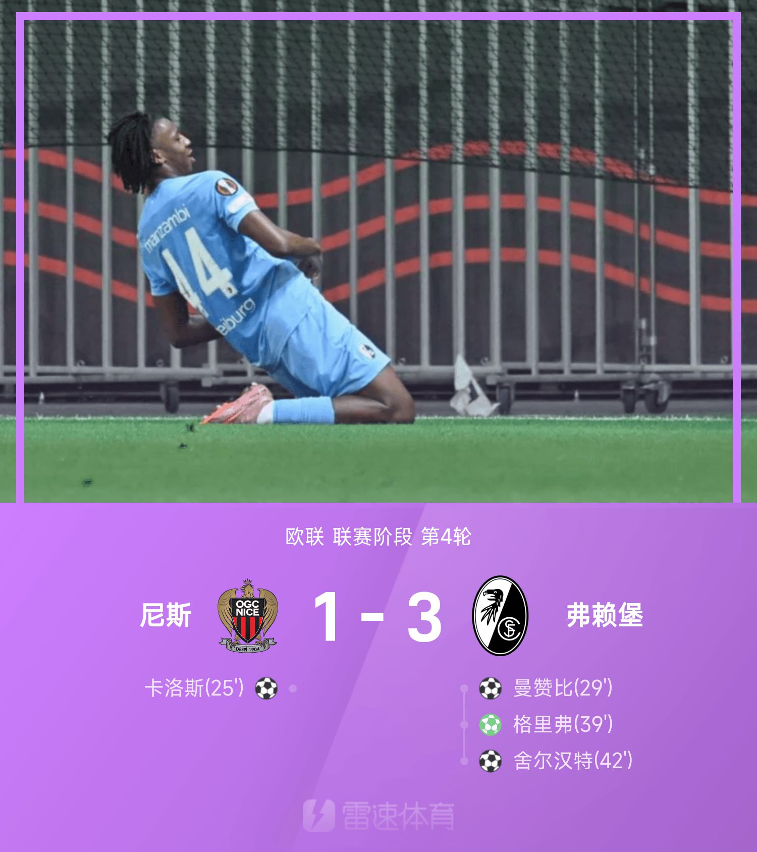 6686 Sports сообщил 7 ноября, что в четвертом туре Лиги Европы 25-26 хозяева поля "Ниццы" встретились с "Фрайбургом". В первой половине этой кампании Карлос забил первый гол с одного удара, Манзамби забил залпом и сравнял счет, Грифо пробил пенальти с 12 ярдов, а Шерхант забил еще один гол из дальнего угла. После смены сторон и новой борьбы ни одна из сторон не забила гола. В конце игры «Фрайбург» победил «Ниццу» со счетом 3–1.