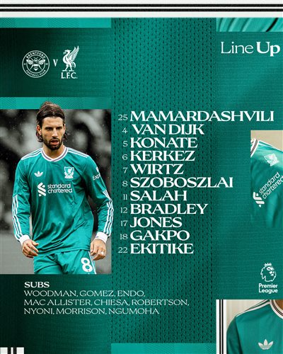 Стартовый состав «Ливерпуля»:25 — Мамардашвили, 4 — Ван Дейк, 5 — Конате, 6 — Кайл Кез, 12 — Брэдли, 8 — Собошлай, 17-Джонс, 18-Гакпо, 7-Вильц, 11-Салах, 22-Экитик