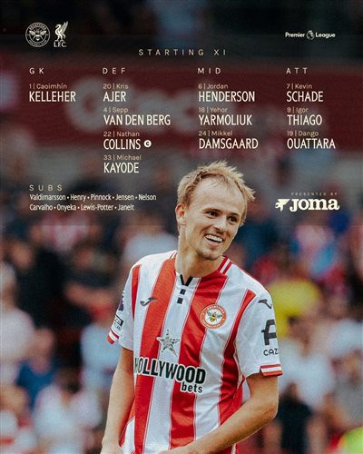 Стартовый состав Брентфорда:1-Келлехер, 20-Айер, 4-Ван ден Берг, 22 - Коллинз, 33 - Кайоде, 6 - Хендерсон, 18 - Ярмолюк, 24 - Дамсгаард, 7 - Шад, 9 - Тьяго, 19 - Уаттара