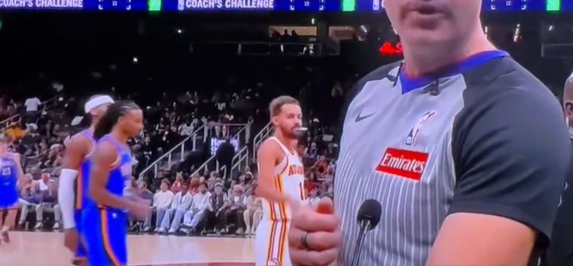 СМИ США опубликовали видео: Трэй Янг сделал жест большим пальцем вниз за спиной рефери, чтобы выразить свое недовольство, когда «Тандер» потребовал от рефери изменить решение.