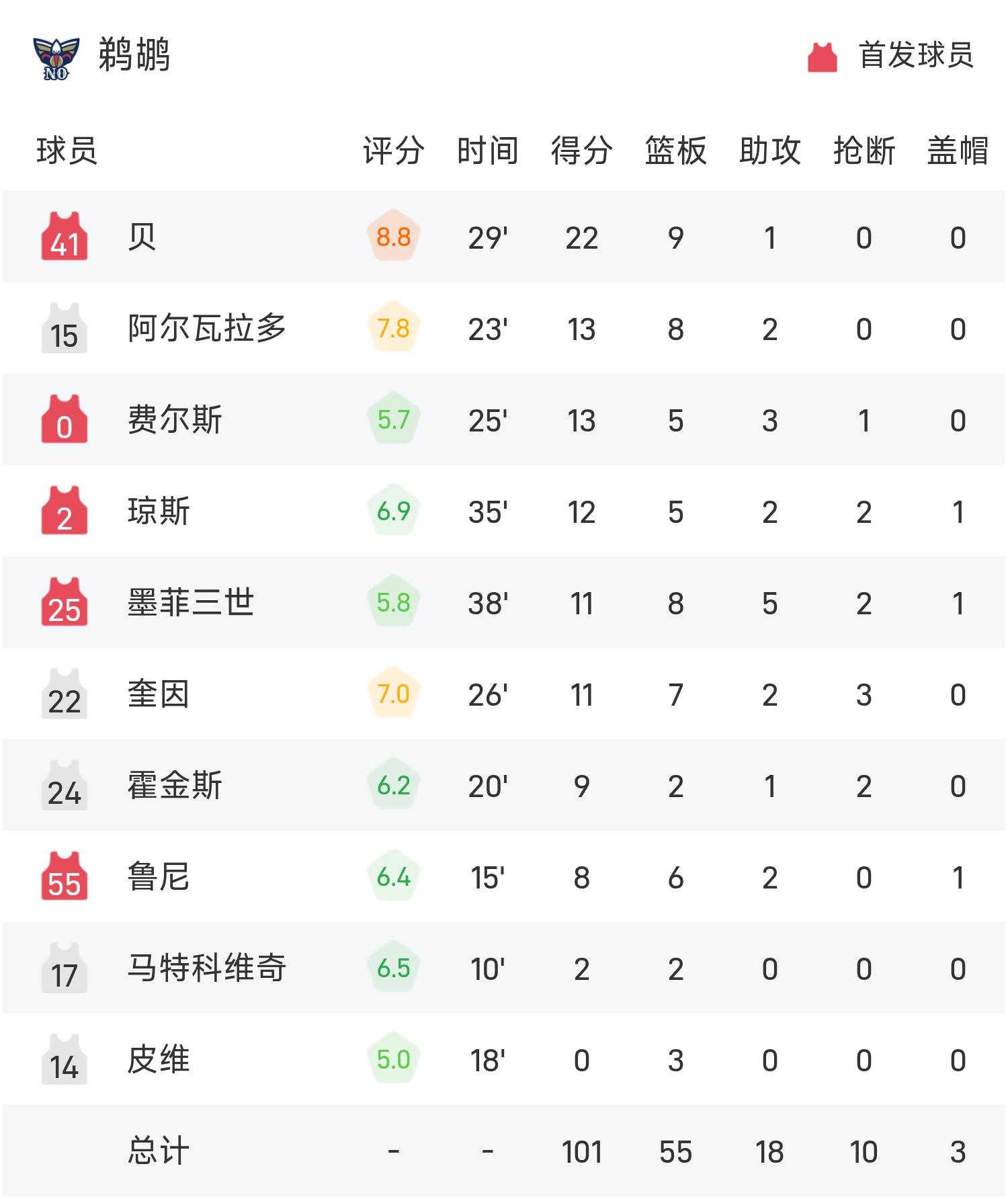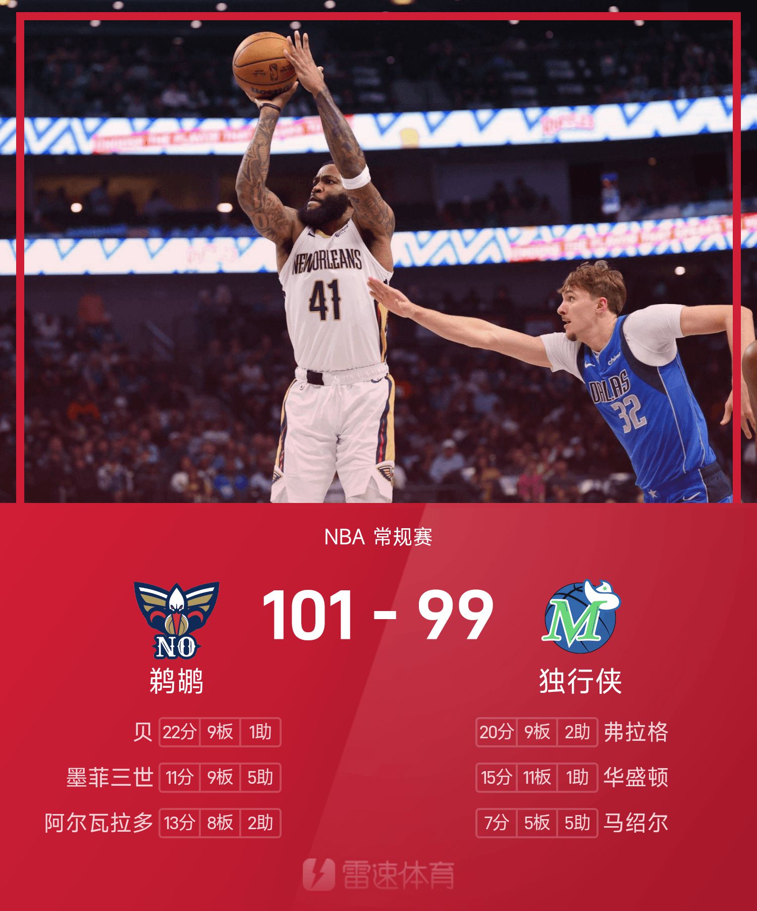 Бей набрал рекордные для игры 22 очка, 9 подборов и 1 передачу, что привело «Пеликанс» к победе. Флэгг, лучший игрок «Маверикс», пропустил ничью и набрал 20 очков.