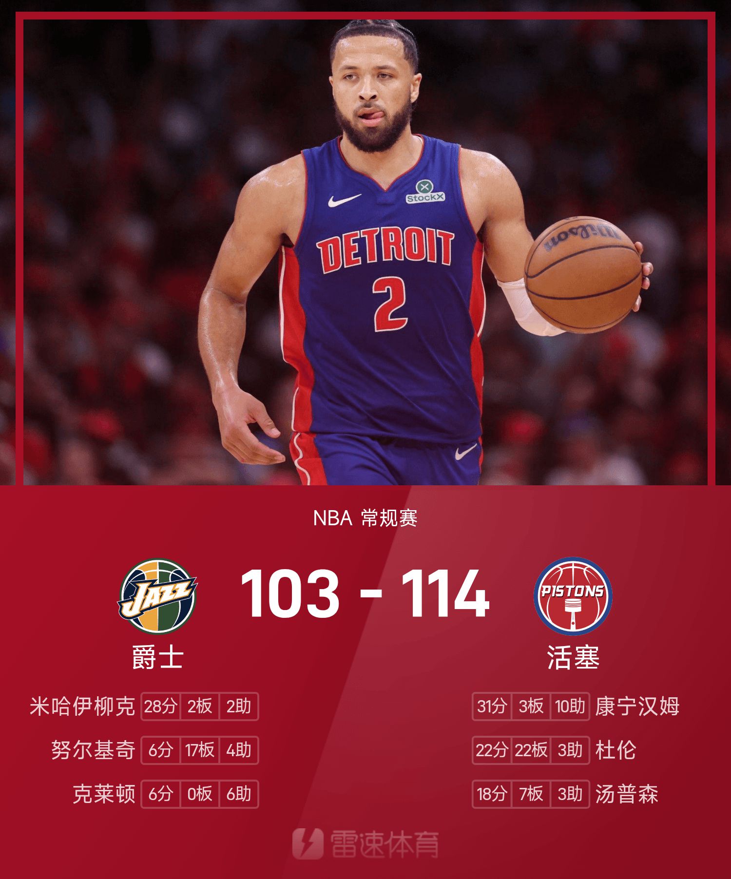 На счету Каннингема 31 очко и 10 передач, у Дюрена 22 очка и 22 подбора, а «Пистонс» обыграли «Джаз».