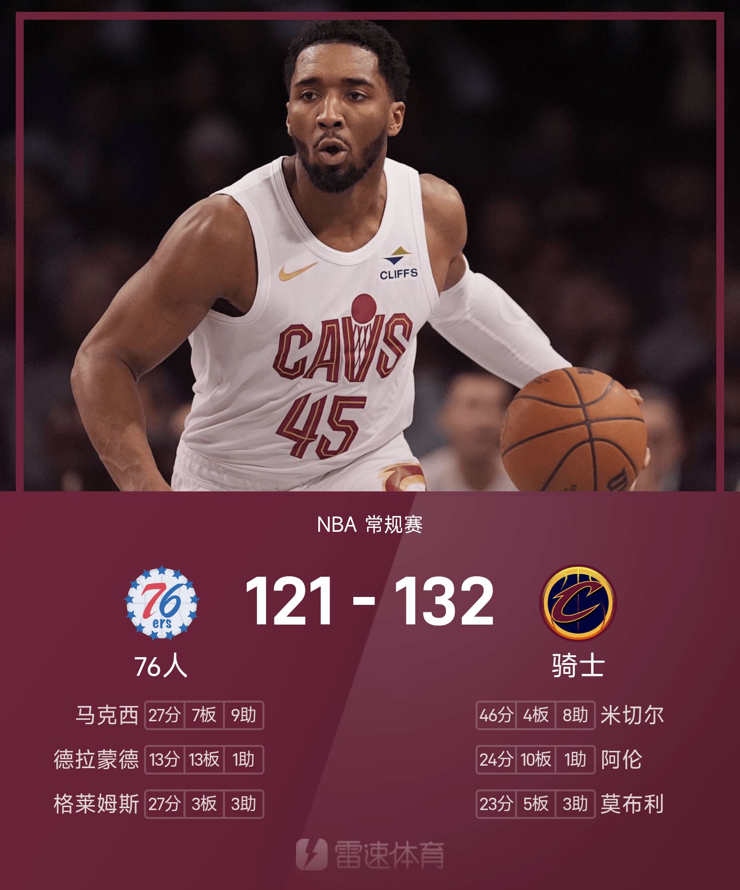 Митчелл набрал рекорд сезона 46 очков, а Cavaliers победили 76ers.