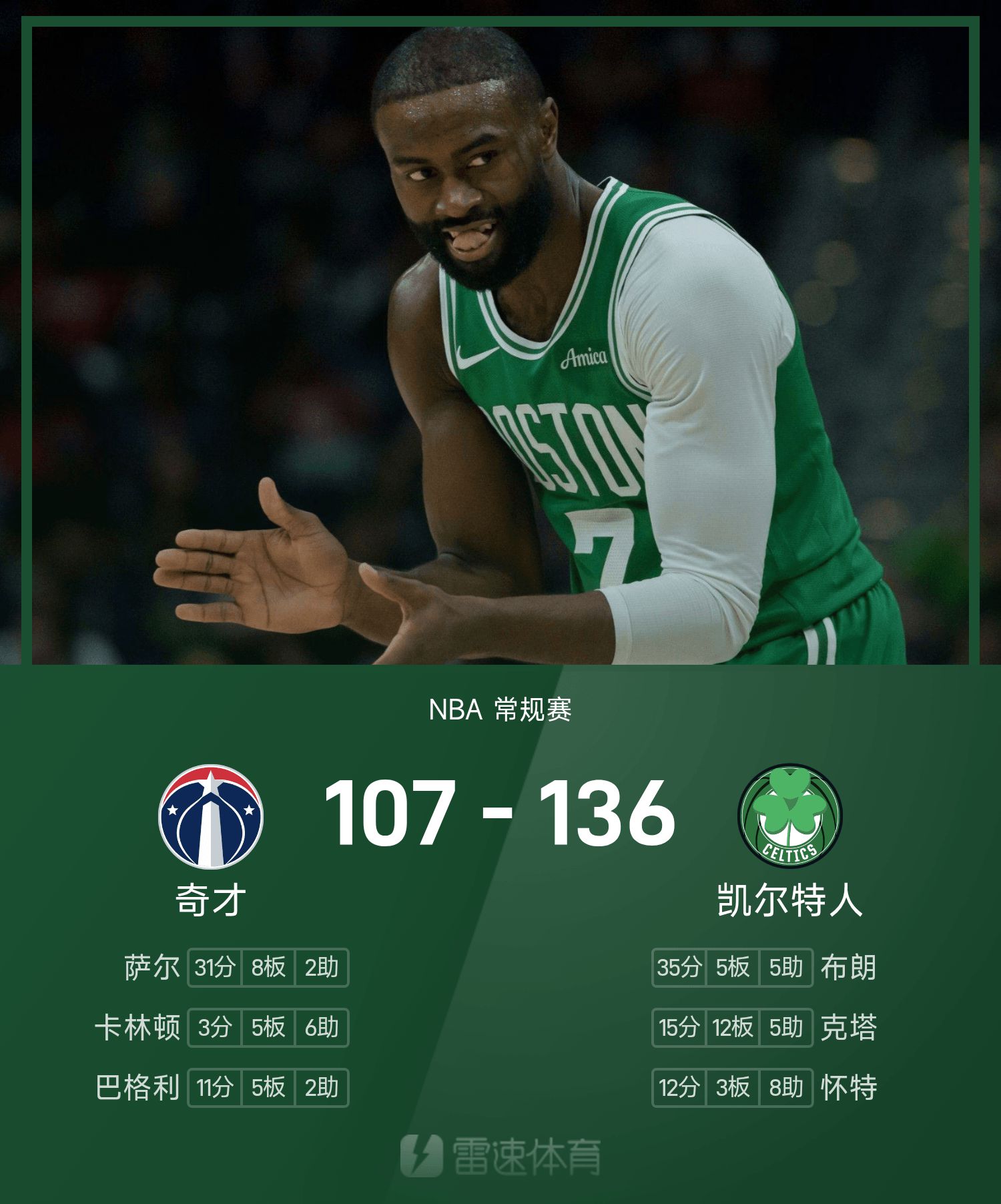 Джейлен Браун набрала 35 очков, а 6 "Селтикс" набрали двузначные числа и обыграли "Уизардс".