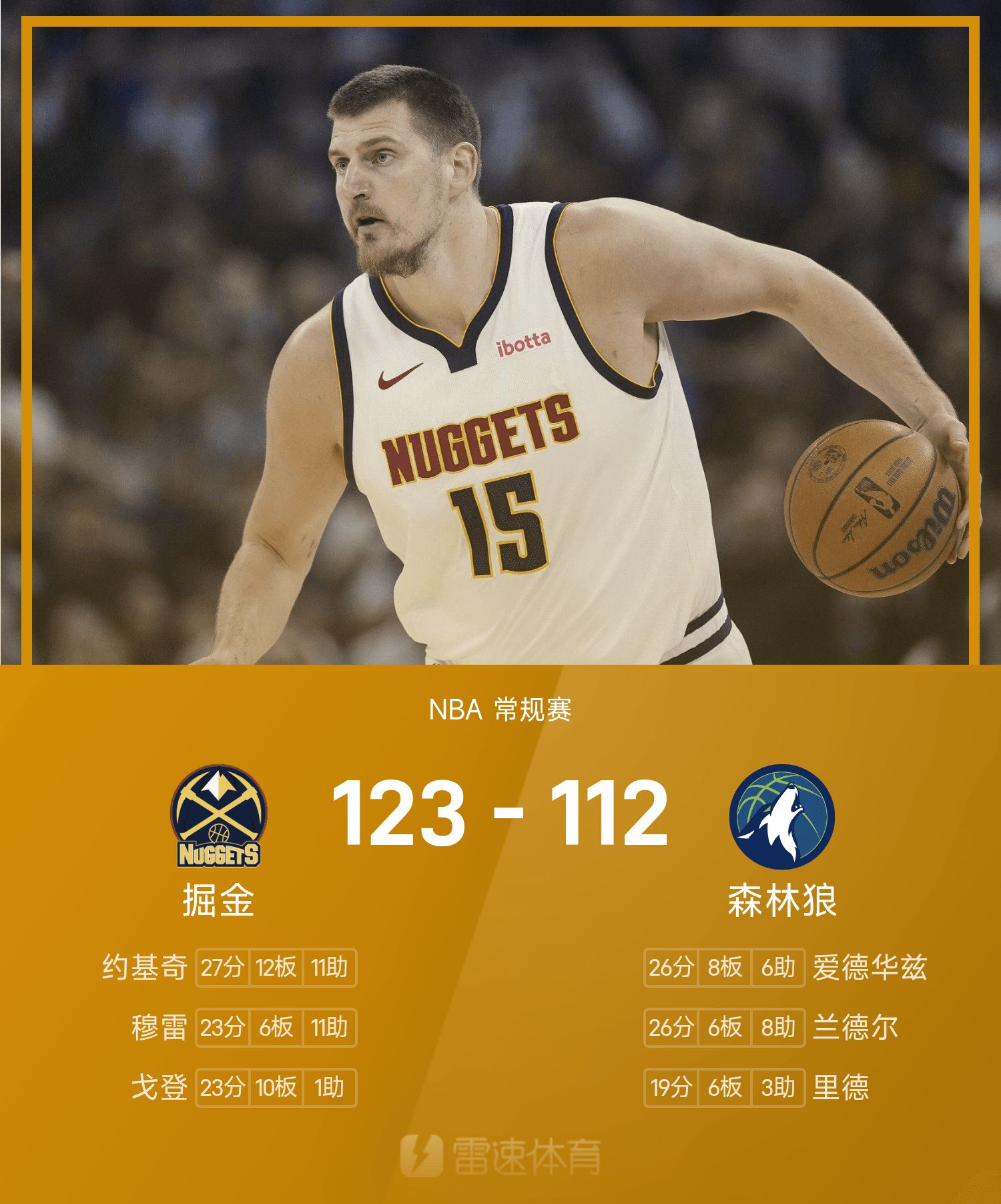 Отчет об игре НБА: Йокич набрал 27 очков, 12 подборов и 11 передач, «Наггетс» разгромили «Тимбервулвз» со счётом 123-112