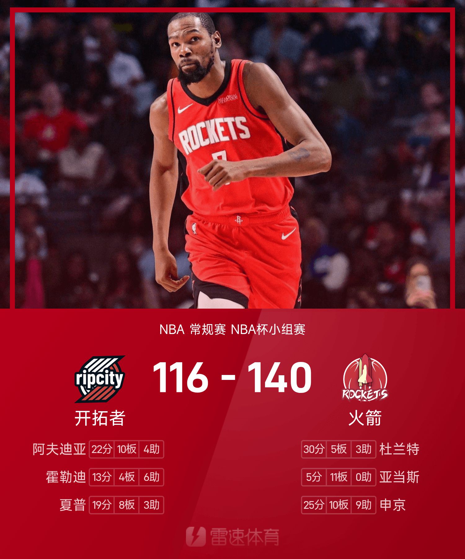 Со значением плюс-минус +37 Дюрант эффективно набрал 30 очков, 5 подборов и 3 передачи, что привело «Рокетс» к легкой победе над Трэйл Блэйзерс.