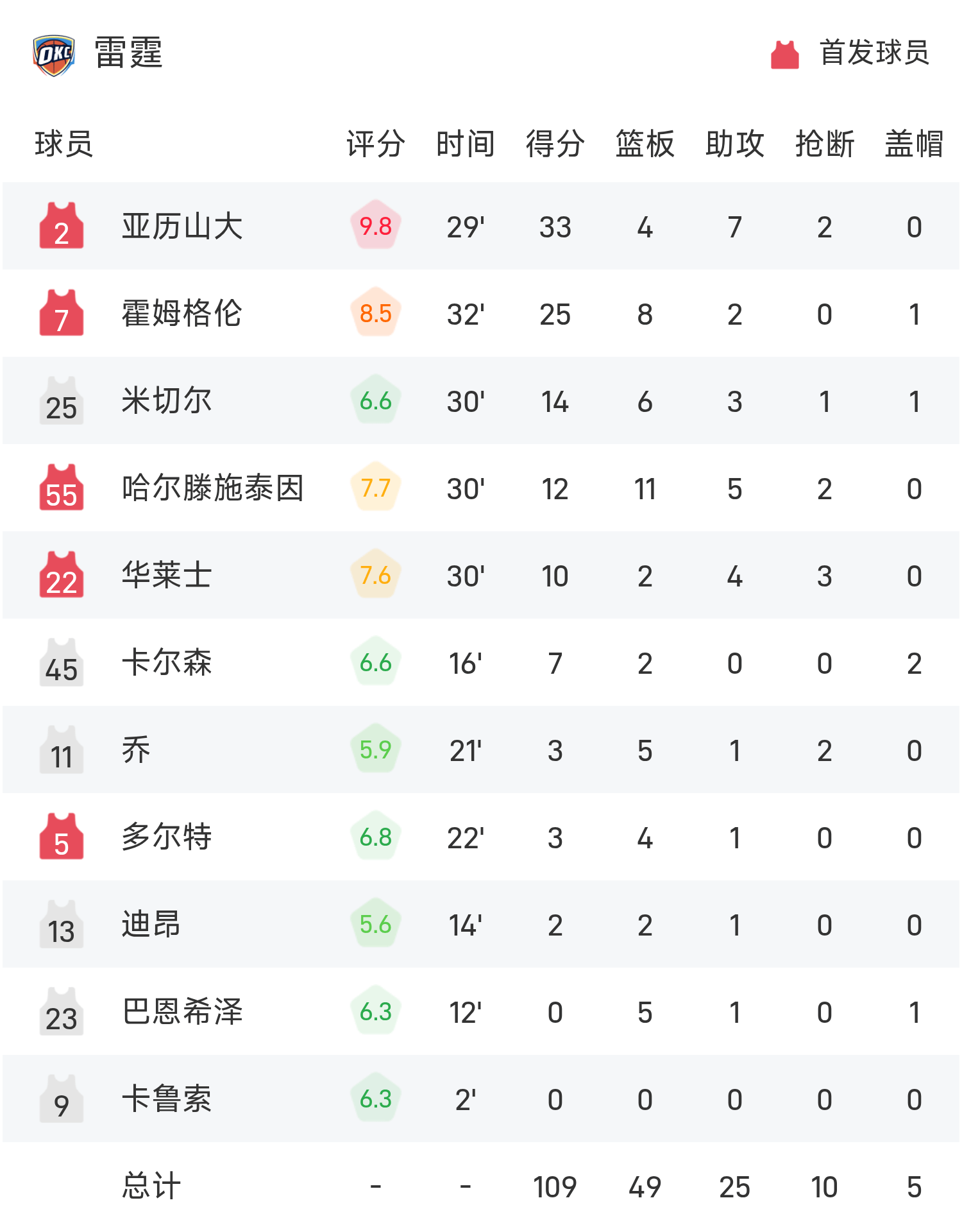 Отчет НБА: у Александра 33 очка и 7 передач, Тандер обыграл Хорнетс со счетом 109-96