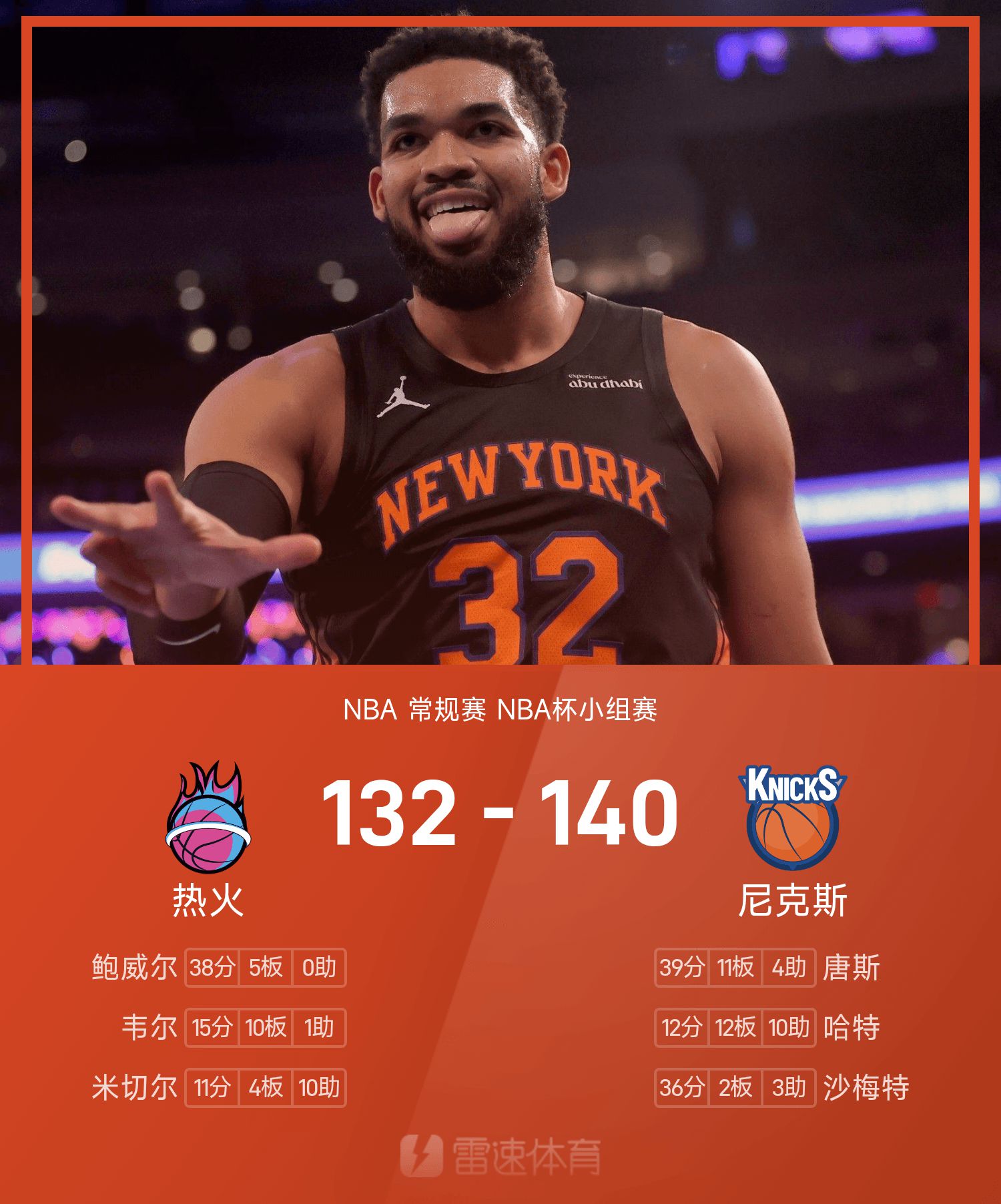 6686 Спорт 15 ноября Новости В групповом матче Кубка НБА регулярного сезона НБА 25/26 «Никс» встретились с «Хит». В конце игры «Никс» победили «Хит» со счетом 140–132. Таунс набрал рекордные в игре 39 очков, 11 подборов и 4 передачи, что привело «Никс» к победе.
