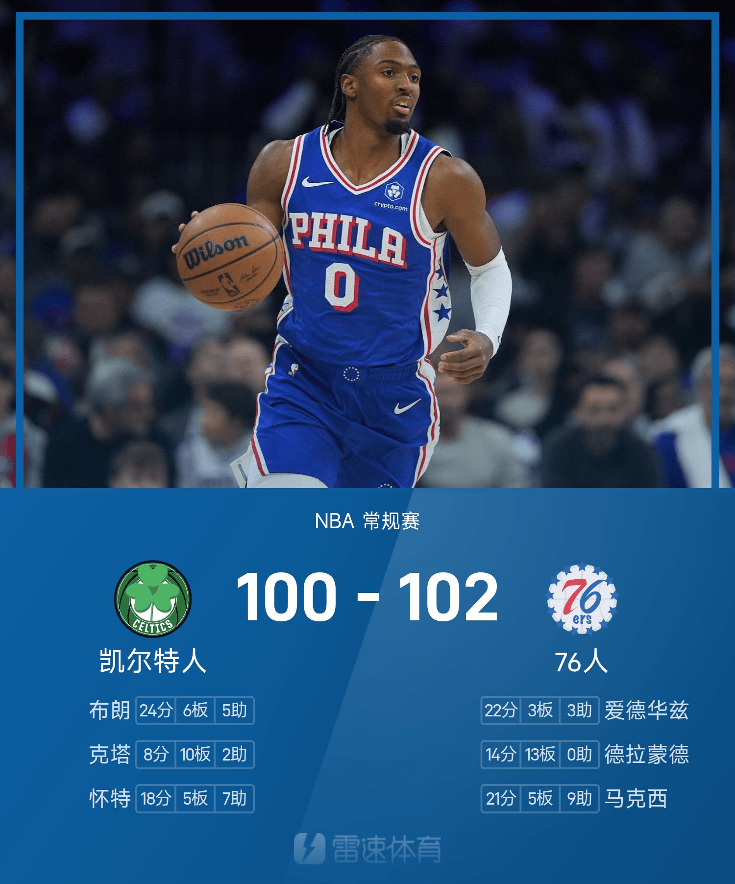 Макси набрал 21 очко и сделал 9 передач, объединив команду. «76ers» с небольшим преимуществом обыграли «Селтикс» с разницей в 2 очка.