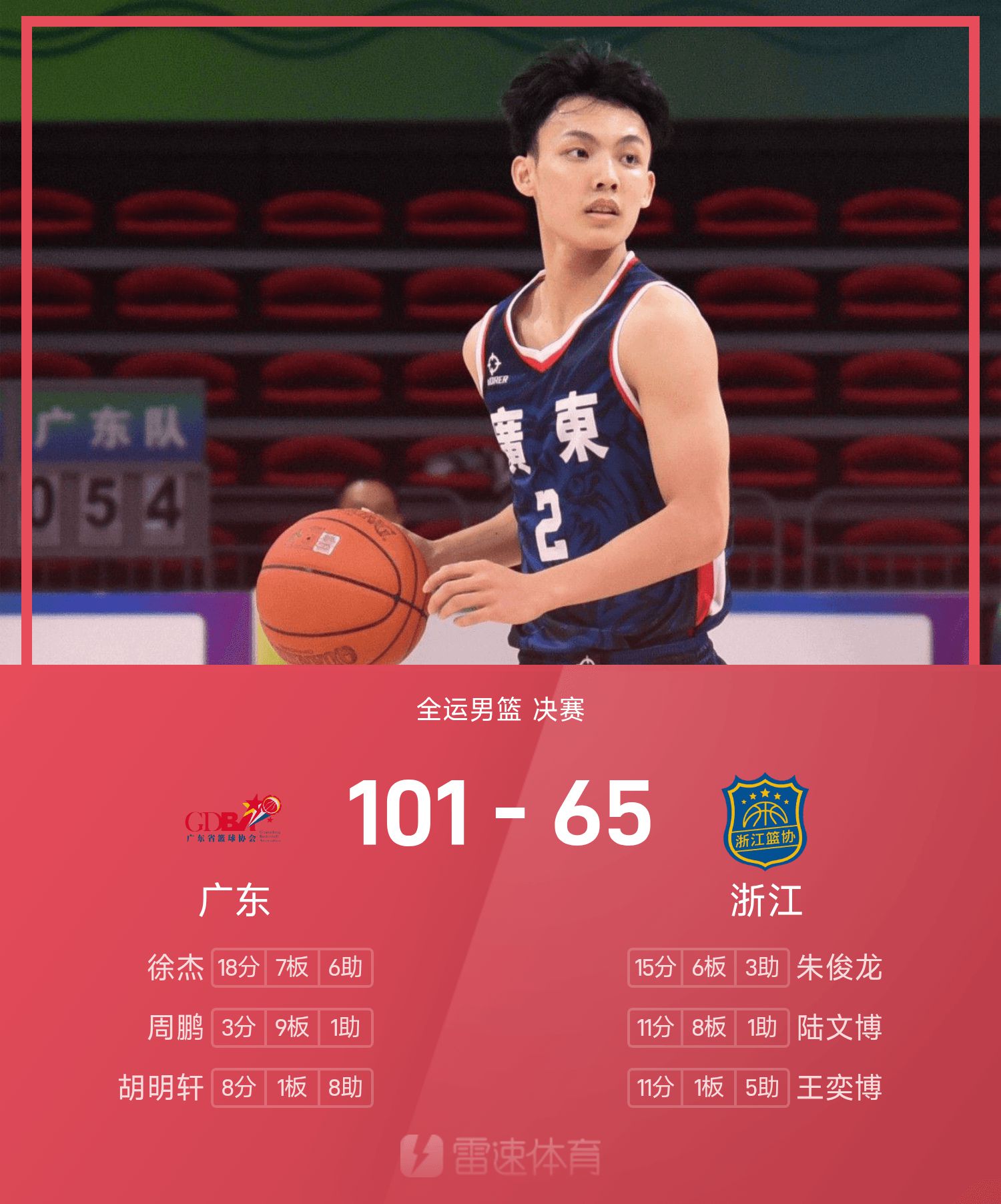 Финал мужских баскетбольных соревнований Национальных игр: Сюй Цзе набрал 18 очков, 7 подборов и 6 передач, Гуандун обыграл Чжэцзян со счетом 101–65 и завоевал золотую медаль