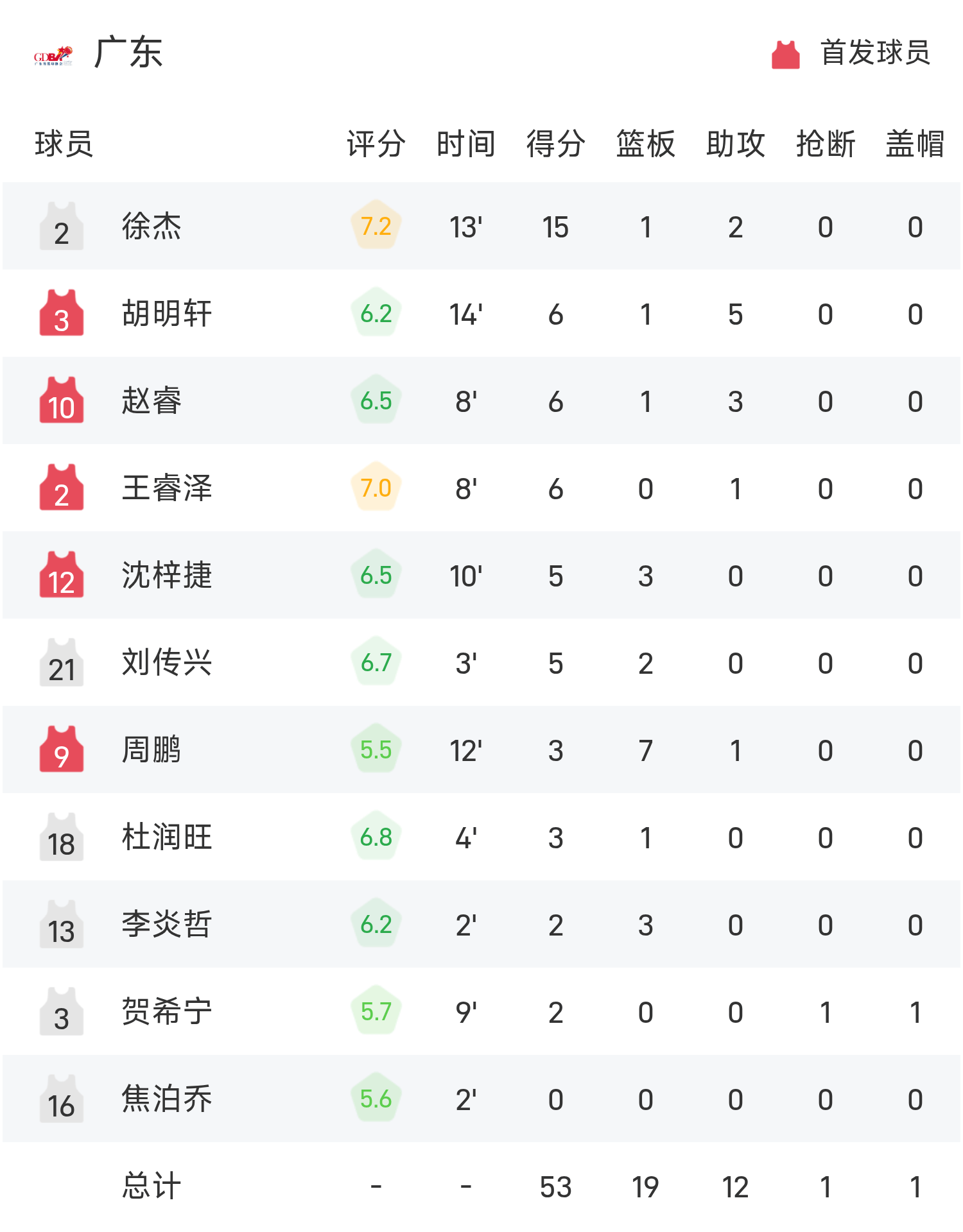 Финал мужских баскетбольных национальных игр Перерыв: Чжу Цзюньлун 13+5, Сюй Цзе 15 очков, Гуандун 53–42 Чжэцзян