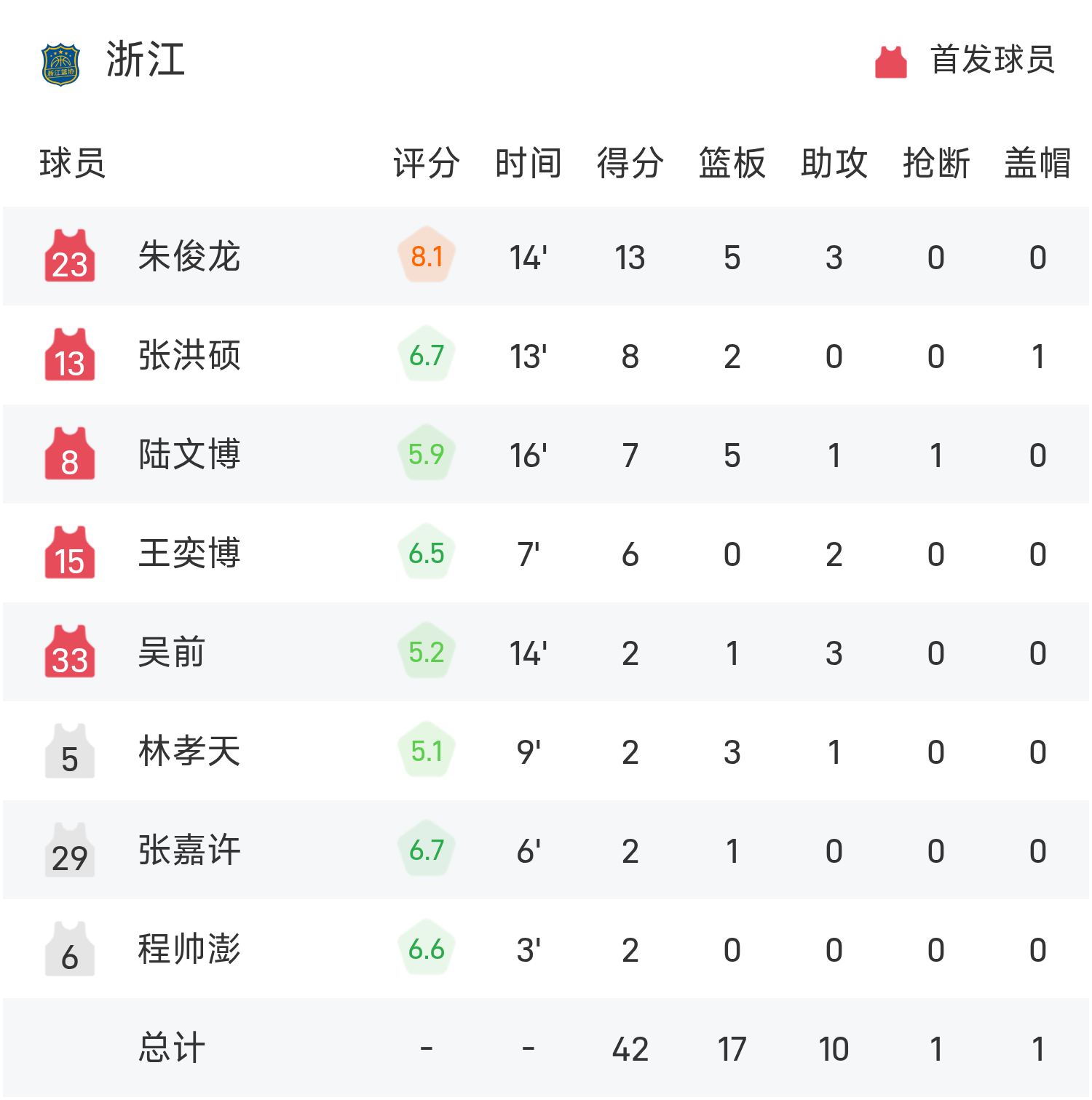 Запасной игрок провинции Гуандун Сюй Цзе набрал 15 очков, 1 подбор и 2 передачи, а стартовый нападающий провинции Чжэцзян Чжу Цзюньлун набрал рекордные для команды 13 очков, 5 подборов и 3 передачи.