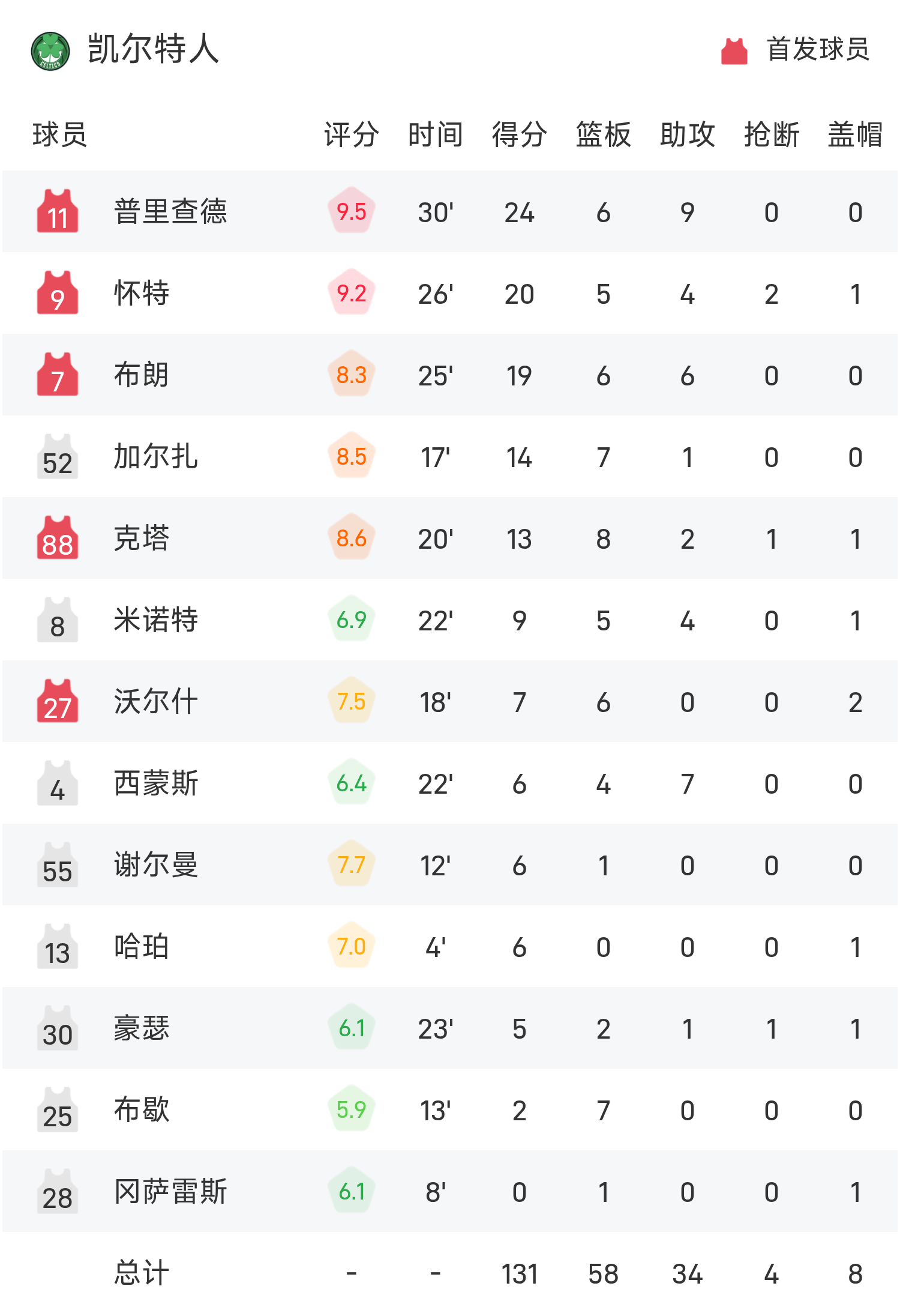 Причард набрал рекордные для игры 24 очка, 6 подборов и 9 передач, что привело «Селтикс» к победе.