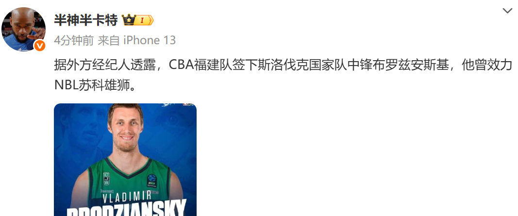 Представитель СМИ: Мужская баскетбольная сборная провинции Фуцзянь подписывает контракт с пятым номером Брозяньски в сборной Словакии